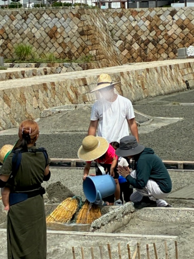 山口県防府市の「三田尻塩田記念産業公園」では、毎年夏休み期間に「親子で塩浜体験」が行われています。復元塩田で、昔ながらのやり方でかん水(濃い塩水)をつくり、これを釜で煮詰めて塩をとりだすまでの一連の塩づくりが体験できます。 塩田での作業は炎天下で行われるため、熱中症への注意がとても大切です。そこで、このイベントの参加者やその他の来場者の方、また作業スタッフに、塩と暮らしを結ぶ運動の塩タブレットやウチワを提供し、熱中症予防に活用していただきました。
