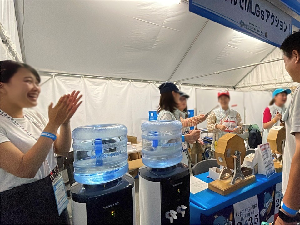 運営側と事前に打ち合わせを重ねることで、設置場所やボトル水の本数予測、不足時のシュミレーションなどを行い、当日を迎えることができました。 また、マイボトルがない方向けにバイオマスプラスチック製や、リサイクル素材製といったSDGsを重視した素材のカップで準備をいただきました。 お渡しの際に「エコな素材でご提供しています」とお伝えし、環境への意識を高めていただくきっかけにもなりました。 両日ともに30℃に迫る気温の中での開催となったため、「こまめに水分補給してください」といった声かけを常に行いました。