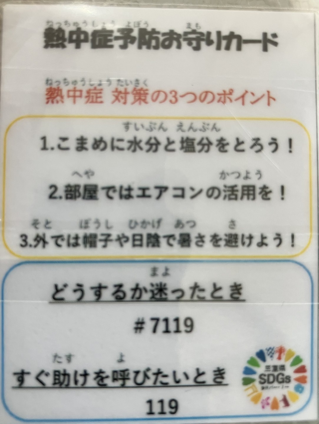 学童30周年記念から、親しみのある郷土の各キャラクターが登場しております。限られたスペースに熱中症対策を3点に絞り、簡潔にわかりやすい言葉を選び、携行できるカードとしました。