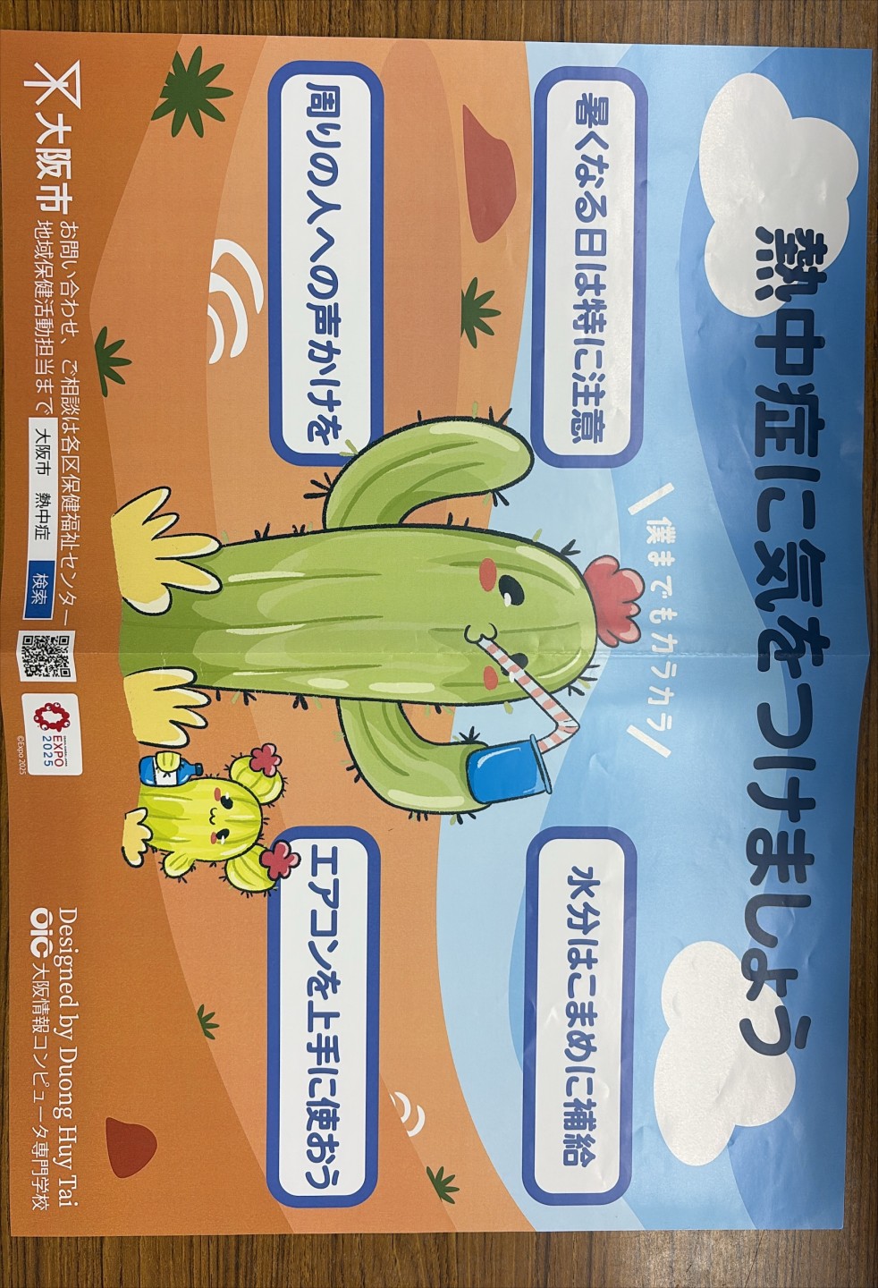 市内のデザイン専修学校との連携により、応募作品から選出したキャッチーなデザインを用いて令和7年度のうちわ16,000部及びポスター2,400部を作成し、市役所及び各区役所、大阪メトロ駅構内等をはじめとする各関係先において配布・掲示することで熱中症予防に関する啓発を行った。また、リーフレットについては、92,000部を作成のうえ、市役所各部署、民生委員・児童委員、社会福祉協議会、地域包括支援センター、市立幼稚園、保育所、学校等において配布し、熱中症にならないための予防策や熱中症になった時の対処法などの啓発を行った。 さらに市内の郵便局大規模店舗においてもポスター掲示の協力をい ただき、広く周知啓発を行った。
