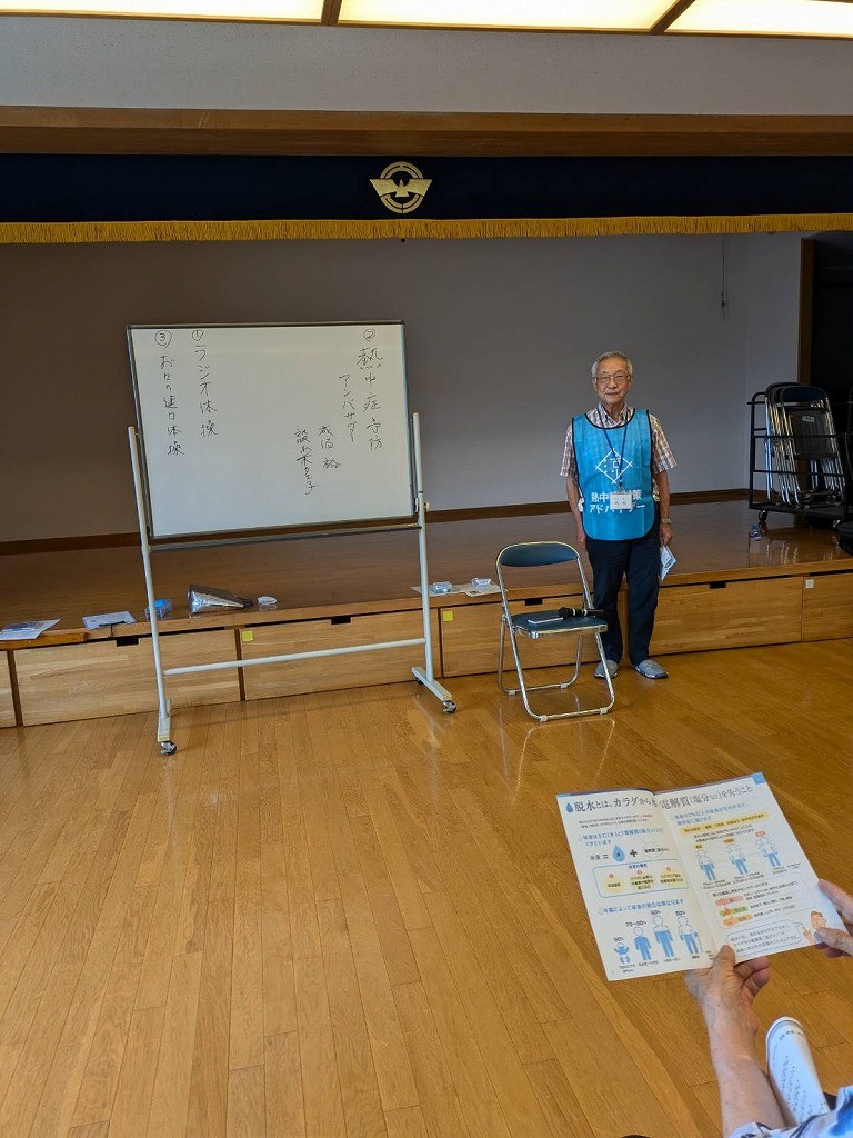 フレイルチェック測定会やフレイルサポーター定例会にて20名~50名集まる会場にて、必ず「水分補給しましょう!」と必ず声掛けをして「水分補給おじさん」のイメージを定着させられた。また、今年度は地区サロンに出見て行って「熱中症対策の説明会」を3ヵ所で実施できた。特に第一回目のサロンでは自分で作ったパワーポイントと自分のパソコンとプロジェクターを持ち込んで行いました。説明時は自費で購入したビブスを着用しました。