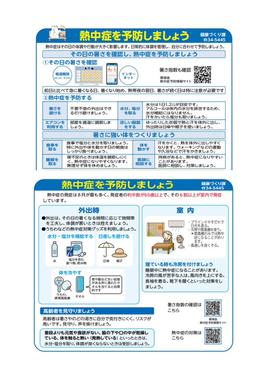 <広報誌における啓発> 月1回発行の市の広報誌に、5月1日号~8月1日号までの各回(計4回)に熱中症についての知識や注意換気等の記事を掲載しました。 今年度は新たに内容に高齢者と同居している家族に対する記事も掲載し、間接的に高齢者の熱中症予防につながるようにしました。 5月1日号:梅雨入り前の予防について 6月1日号:暑熱順化について 7月1日号:暑さに対する熱中症予防行動、日頃からの熱中症に対する備え 8月1日号:外出時と自宅内での熱中症の注意、高齢者と同居している家族に対する注意喚起 <X、LINEにおける啓発> 5月から8月までの4ヶ月間、月1~4回程度X及びLINEにて熱中症についての記事を掲載しました。 <地域FMラジオにおける啓発> 5月12日に地域のFMラジオで、熱中症についての「今からできる熱中症予防」をテーマに放送しました。