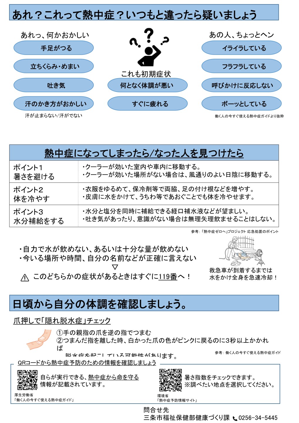 商工会、商工会議所のHPに市が作成した熱中症予防リーフレットを掲載いただき、就労者に対して周知を行いました。また、今年度は協会けんぽ新潟支部メールマガジンにも掲載し、周知を行いました。 チラシの内容としては業種別の熱中症搬送者数や、各業種の対策のポイント等データを分析したものを掲載しました。