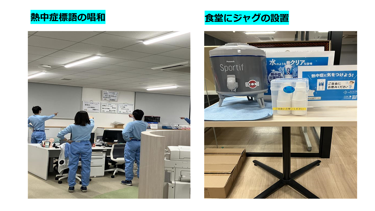 工場内における熱中症予防を目的に、環境整備・情報発信・意識啓発を組み合わせた取組を実施しました。具体的には、工場内24か所に熱中症対策キットを配置し、作業中や体調不良時にすぐ活用できる環境を整えました。従業員が日常的に利用する食堂にジャグを設置し、休憩時等に自由に水分補給が確実に行える環境を整えました。さらに、熱中症予防標語を従業員から募集し、7・8・9月の朝礼にて唱和することで、継続的な注意喚起を行いました。加えて、熱中症アラート発令時には全従業員へ一斉メールによる注意喚起を実施し、暑さへの意識向上と予防行動を促しました。