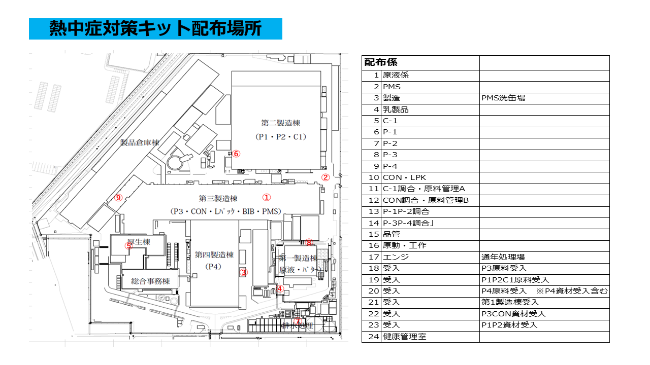 本取組では、工場内での熱中症予防を一過性の注意喚起で終わらせず、継続的な意識づけにつなげることを重視しました。工場内24か所に熱中症対策キットを設置・配布し、必要時にすぐ使用できる環境を整えました。また、従業員の利用頻度が高い食堂にジャグを設置し、休憩時等に自由に水分補給できる環境を整えた。さらに、従業員から熱中症予防標語を募集し、7・8・9月の朝礼で唱和することで、予防意識の定着を図りました。加えて、熱中症アラート発令時には全従業員へ一斉メールで注意喚起を行い、意識啓発を組み合わせた工場内啓蒙とした点が工夫です。