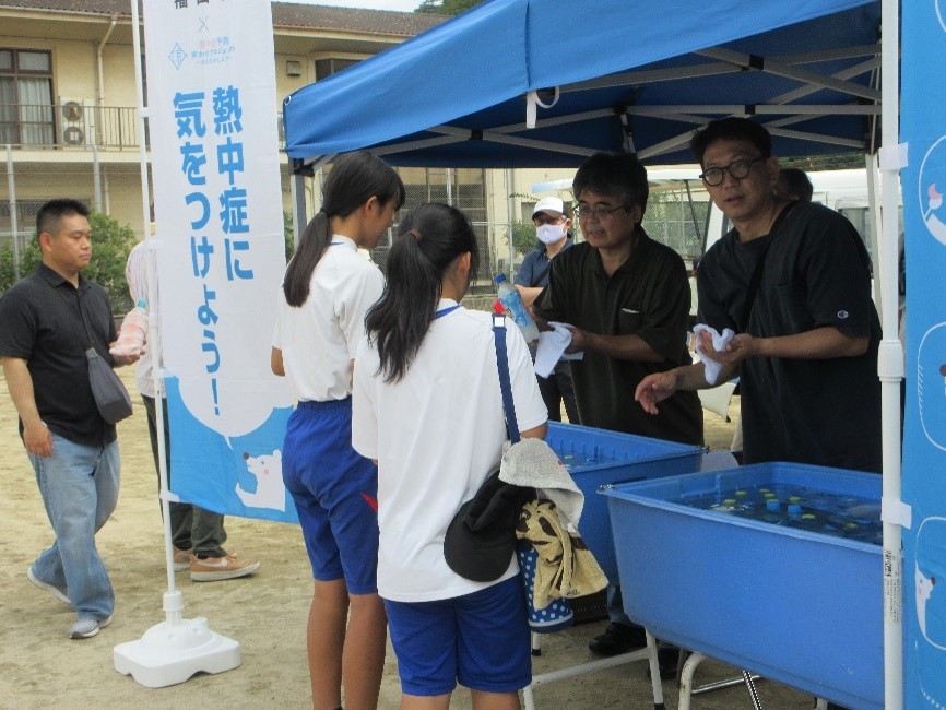 会場に熱中症予防啓発のぼりの設置をしました。 参加者に飲料を配布し熱中症予防の呼びかけを行いました。