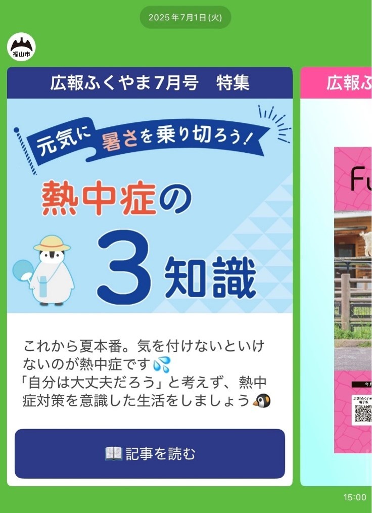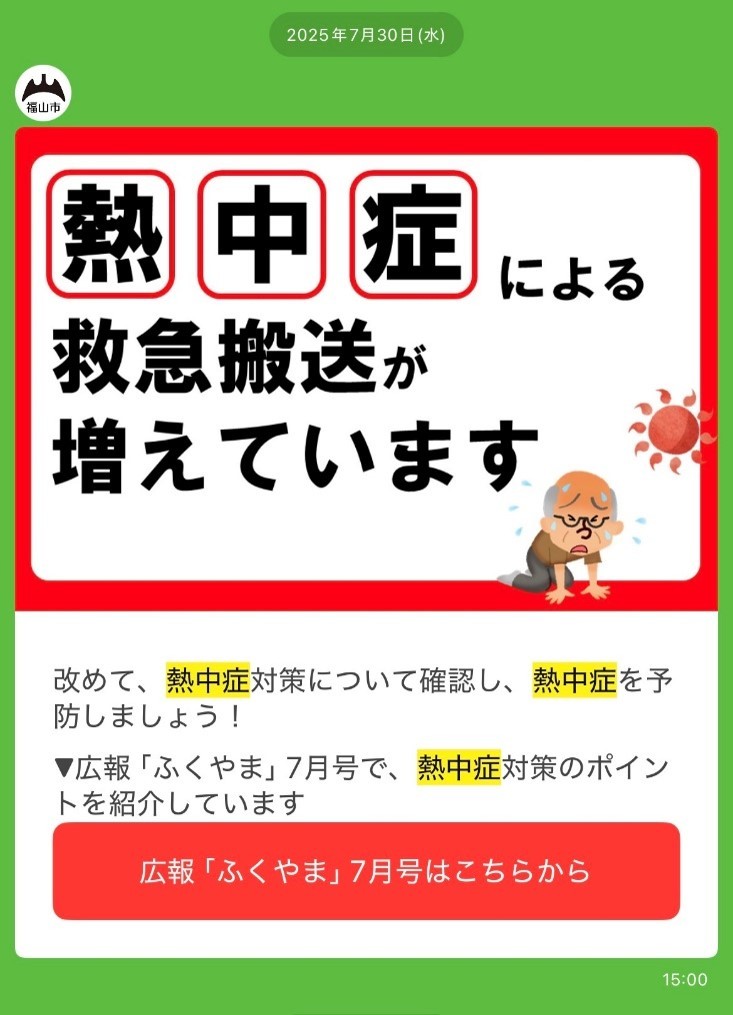 登録者数が約18万人の福山市公式LINEにおいて、暑くなる前の5月に警戒アラートの周知のため、熱中症リスクの高い7月に熱中症を防ぐための知識の周知のため、計3回のLINE配信を行った。