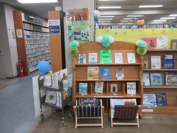 環境月間に合わせ、関連するコーナー図書のコーナーを設置し、読書推進を図るとともに、熱中症についての注意喚起を行いました。