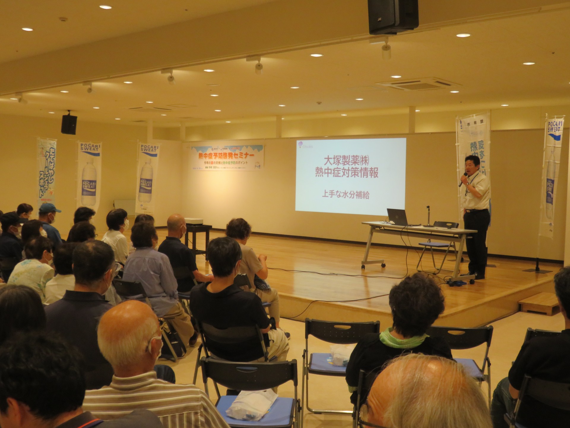 本市と「健康づくりにおける連携に関する協定」を締結している大塚製薬株式会社、クールシェアスポットであるアゼリアモール(市内ショッピングモール)との三者連携による熱中症予防啓発セミナーを開催することにより、クールシェアスポットの利用促進と熱中症予防啓発を図りました。