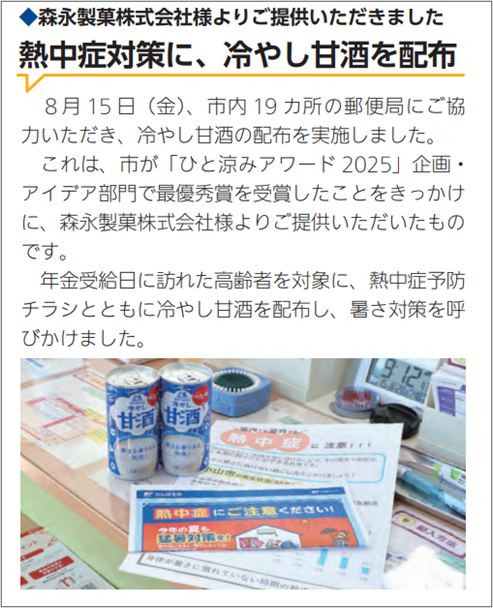 小山市では年に3回、官民連携会議として熱中症対策関係者連絡会議を行っています。会議で世代ごとに合った方法で啓発すべきだと意見があり、市内企業と連携した取り組みを実施しました。 商業施設(イオンモール)から「涼みどころとして何か協力したい」との申し出を受け、6月の日曜日に「涼み処×フレイル予防@イオンモール小山店」を開催しました。イベントでは熱中症に関するスライドの放映、予防啓発チラシの配布、経口補水液の配布を行い、買い物に訪れた市民へ熱中症と、フレイル予防の重要性を周知啓発することができました。 また、昨年より、会議にて郵便局職員から、年金支給日に訪れる高齢者へのアプローチも効果的ではないか、と意見がでたことをきっかけに、年金支給日に郵便局にて高齢者への声掛けを行い、熱中症予防啓発を行っていました。昨年ひと涼みアワードを受賞し、取り組みの紹介を行ったことで、森永製菓株式会社から熱中症対策事業へ協力の申し出がありました。そこで今年度は、郵便局と森永製菓によるコラボ啓発を行いました。森永製菓より提供された冷やし甘酒を活用し、熱中症ハイリスクとなる高齢者用に作成したチラシとともに配布しました