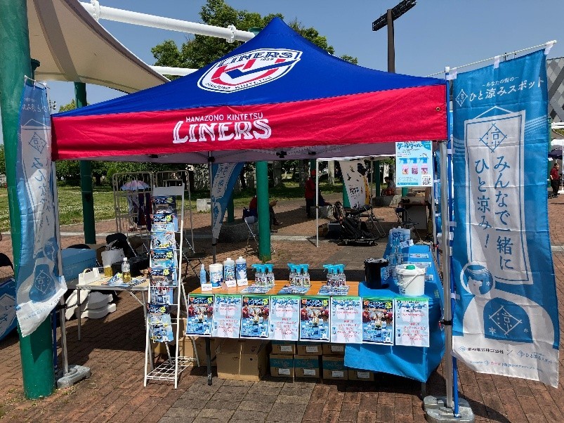 活動への参加を広く認知するために、ブースへのフラッグ設置や熱中症対策アドバイザーのビブスを着用し、熱中症予防を呼びかけました。