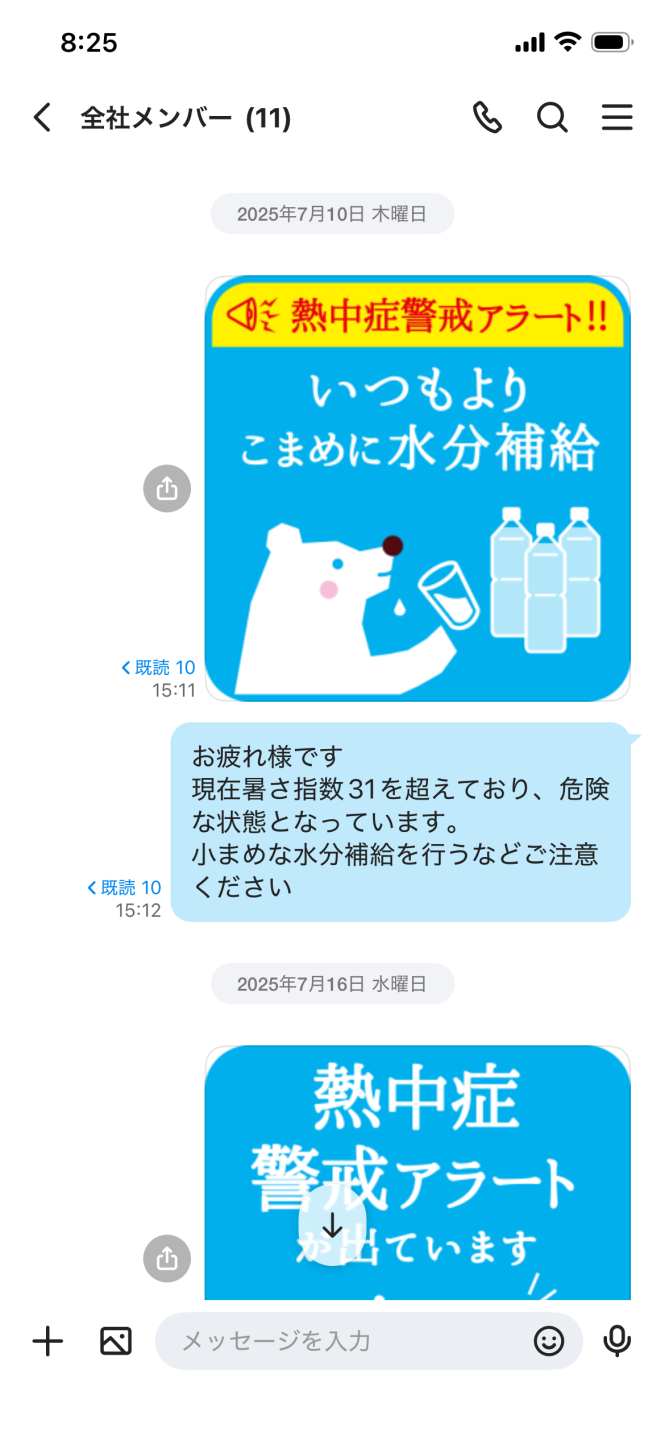 ・熱中症予防声かけプロジェクトのポスターやイラストデータを活用しました ・外に出ている社員もいるため、SNSでの通知はパソコンだけはなく、スマホからの確認もできるようにしました