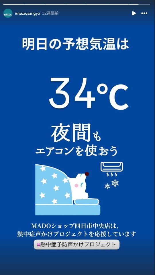 ・Instagramを活用して、毎朝その日の予想最高気温と退勤時間に翌日の予想最高気温を定期投稿 ・定期外では、積極的に熱中症に関した投稿